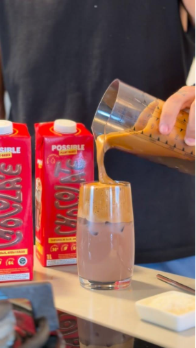 Uma das sugestões é o Coconut Dalgona Possible, inspirado em bebidas de cafeteria e preparado em duas etapas. Para a espuma de café, a receita leva 100 ml de água, 2 colheres de café solúvel e 2 colheres de açúcar demerara, que devem ser agitadas em uma coqueteleira com um pouco de gelo até atingir uma textura cremosa. Em seguida, basta colocar bastante gelo em um copo, adicionar 200 ml de Possible Chocolate e finalizar com a espuma de café e 1 colher de coco seco ralado.